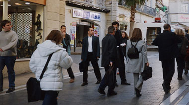 Beispiel: Verteilung von speziellen Flyers in einer Einkaufstrasse. (Allotopie: Aperto und Eric Watier, Montpellier. Allotopie ist eine Wortneuschöpfung von Roberto Martinez, Paris).